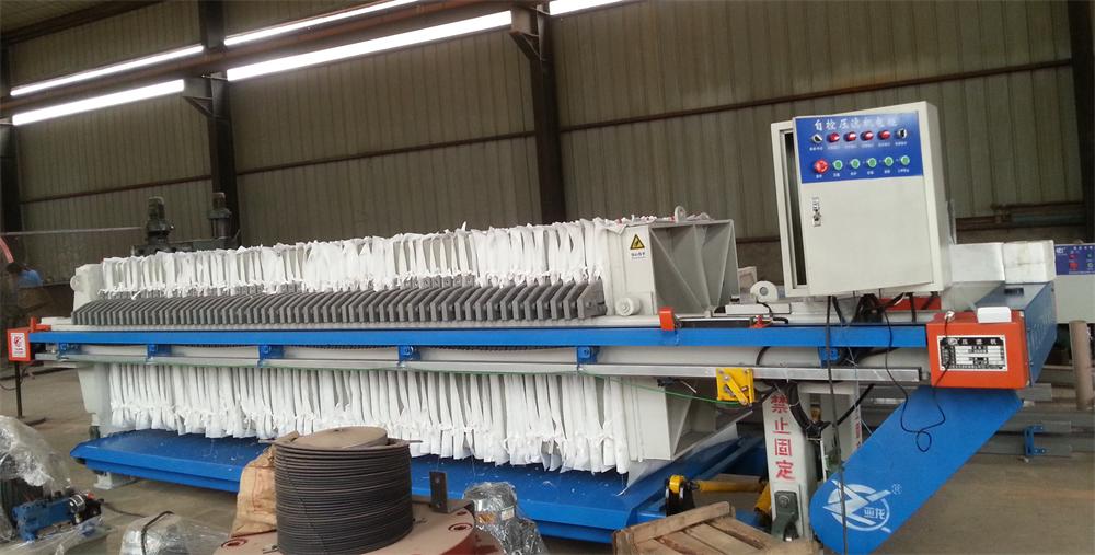 濾布單行走式自動廂式壓濾機(jī)工作時料漿從頂部進(jìn)料口送入,經(jīng)過進(jìn)料、壓榨、洗滌、吹風(fēng)干燥后,油缸啟動,將各濾室同時打開。濾布包著濾餅向下行走,濾餅很容易從濾布上卸除,同時高壓水對濾布進(jìn)行清洗。整個過程能自動實(shí)現(xiàn),大大節(jié)省了人力操作。